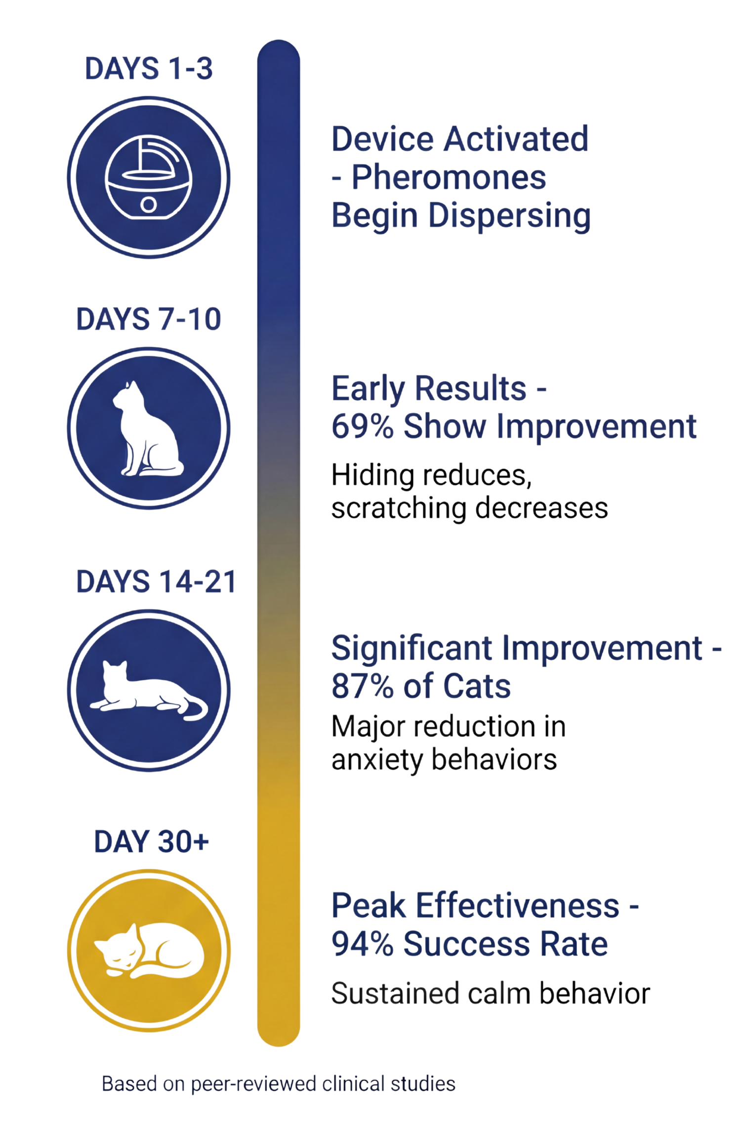 Most cats show noticeable improvement within 7-14 days. Clinical studies show peak effectiveness at 3 weeks of continuous use. Severely stressed cats may take up to 4 weeks.