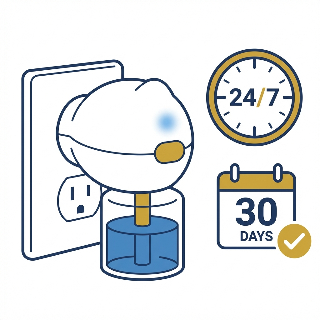 Keep plugged in continuously for best results. Each refill lasts 30 days. Replace monthly to maintain calm behavior.